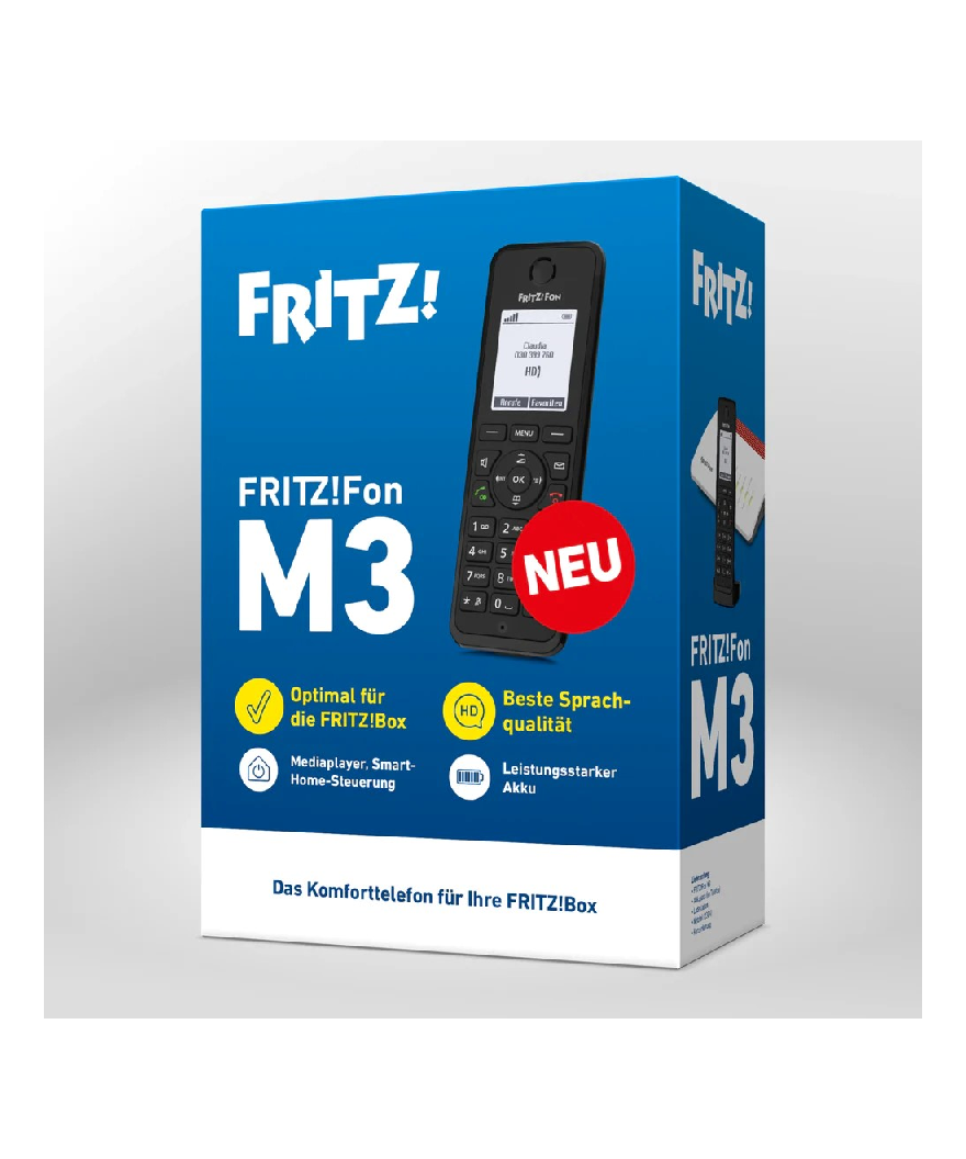 De FRITZ!Fon M3 opent nieuwe horizonten in de communicatie. Als intelligente telefoon van de nieuwste DECT-generatie ondersteunt hij de HD-norm voor telefonie met vaste lijn en VoIP, en maakt hij een gemakkelijk gebruik van internetdiensten en multimedia mogelijk. Een echt communicatietalent met FRITZ!-Faktor!
