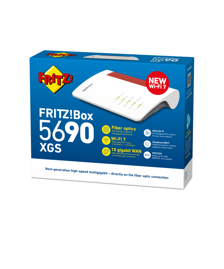 De nieuwe FRITZ!Box 5690 XGS is speciaal ontwikkeld om rechtstreeks aan te sluiten op het moderne glasvezelnetwerk XGS-PON en ondersteunt indrukwekkende gegevenssnelheden van maximaal 10 gigabit per seconde (Gbit/s). Hij heeft krachtige WiFi 7 (4×4), een 10 Gbit/s WAN-/LAN-poort en de vertrouwde functies van de FRITZ!Box voor telefonie , smarthome en netwerk aan boord. De FRITZ!Box 5690 XGS is dé ideale glasvezeloplossing voor veeleisende breedbandtoepassingen.