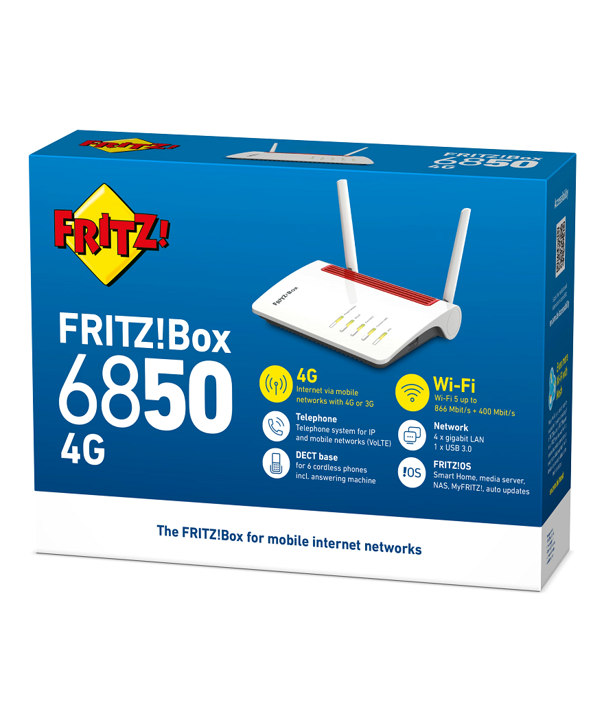 FRITZ!OS, het besturingssysteem van je FRITZ!Box, krijgt regelmatig nieuwe functies. Dankzij de FRITZ!Apps kun je ook onderweg via je smartphone toegang krijgen tot je gegevens, in je thuisnetwerk bellen of je smarthome aansturen. De FRITZ!Box 6850 4G ondersteunt naast de smarthome-apparaten van FRITZ! ook van andere fabrikanten apparaten met de DECT-ULE/HAN-FUN-technologie. Alle updates en apps voor de FRITZ!-producten zijn uiteraard gratis.