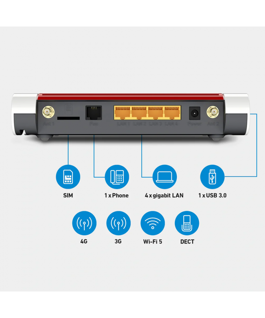 FRITZ!Box 6850 4G zorgt voor snelle downloads met LTE, terwijl je geniet van alle gemakken die de FRITZ!Box biedt: met de geïntegreerde DECT-basis kun je comfortabel bellen met tot wel zes draadloze telefoons. Betrouwbare Wi-Fi verbindt je apparaten in het thuisnetwerk met het snelle mobiele internet.