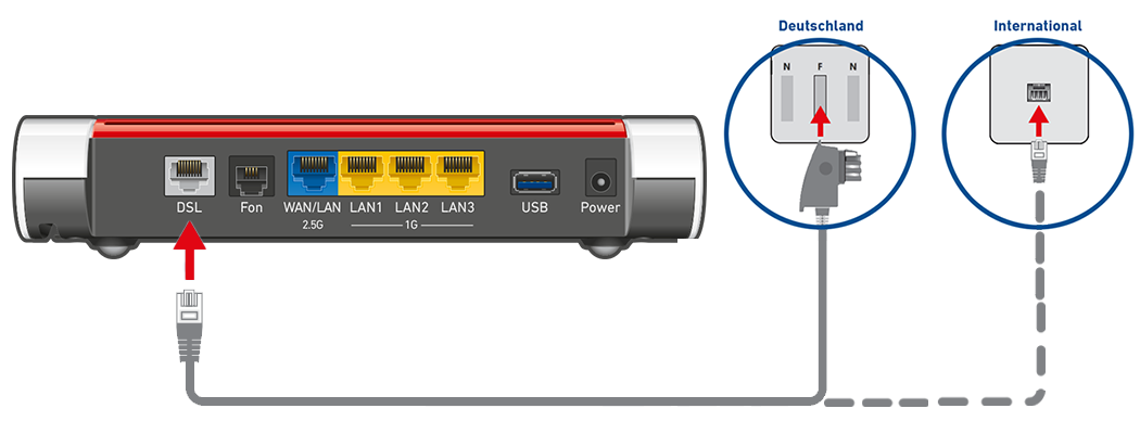Op veel DSL-aansluitingen kan de met de DSL-provider overeengekomen maximale gegevenssnelheid niet volledig worden bereikt. Om erachter te komen of de door de FRITZ!Box bereikte gegevenssnelheid wordt beperkt door de aansluiting of door een storing, controleer je de gegevenssnelheid met een andere DSL-modem: